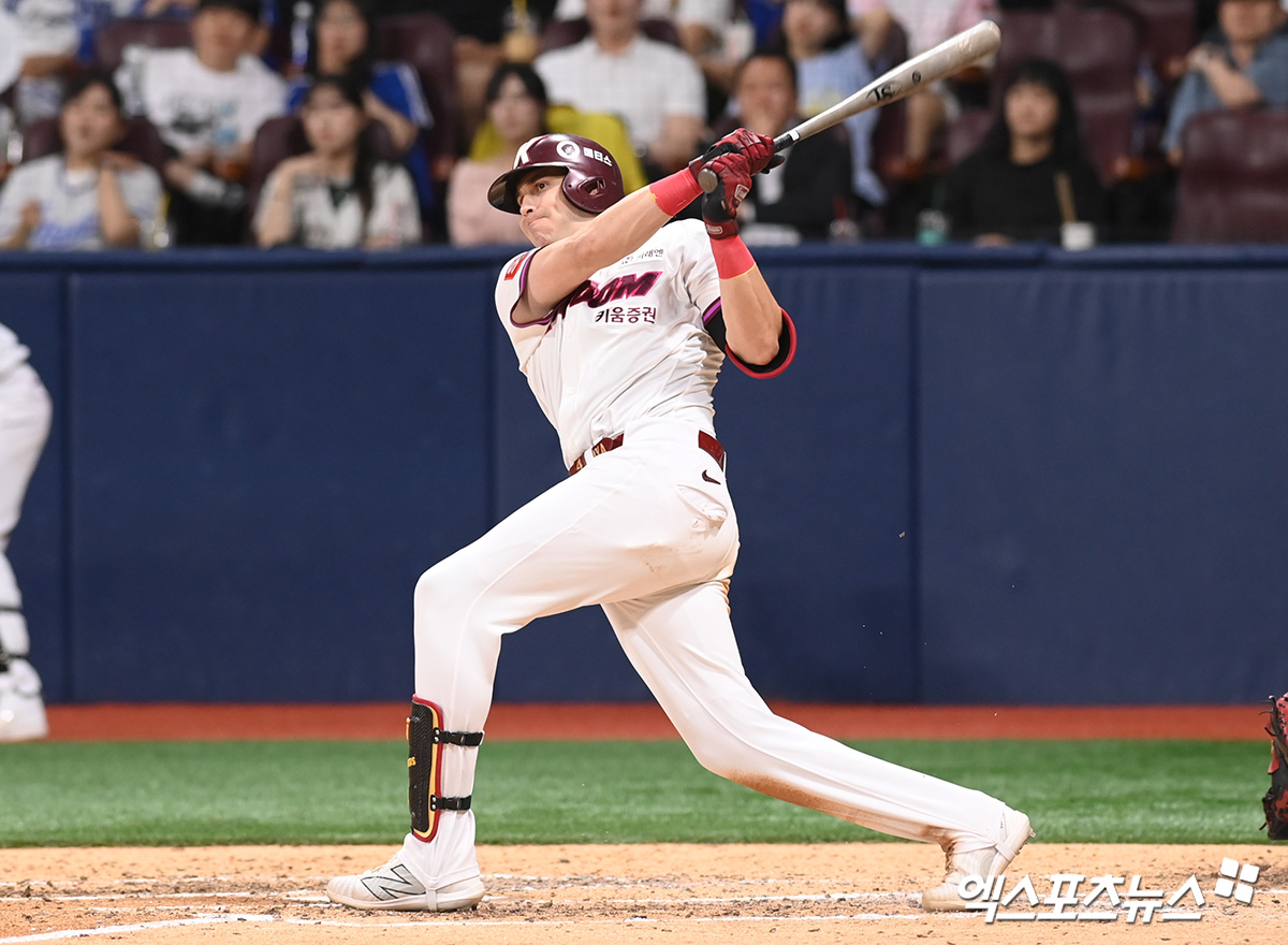 (엑스포츠뉴스 고척, 고아라 기자) 21일 오후 서울 구로구 고척스카이돔에서 열린 '2025 신한 SOL Bank KBO리그' 삼성 라이온즈와 키움 히어로즈의 경기, 8회말 2사 1루 키움 카디네스가 안타를 날리고 있다.