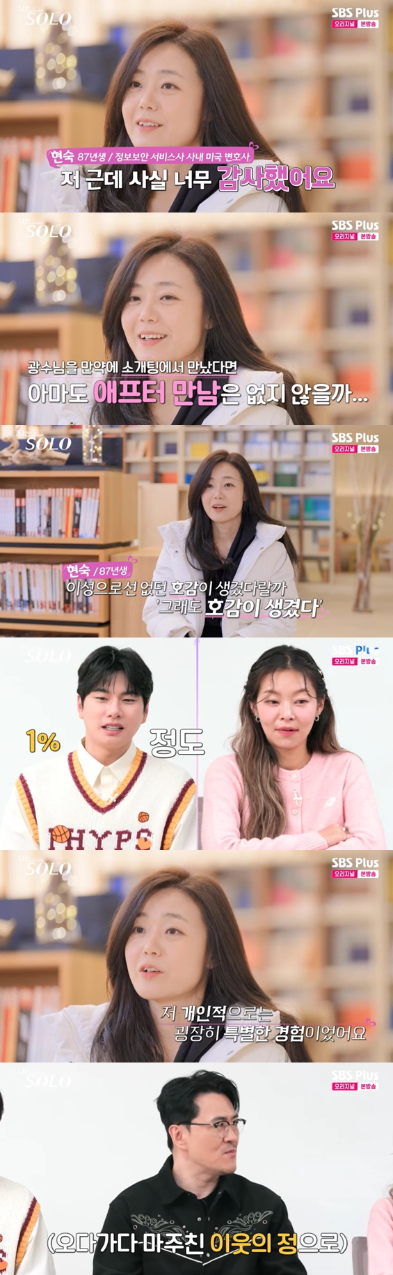 현숙은 광수와의 데이트에서 "광수 님을 소개팅에서 만났다 하면 아마도 애프터 만남은 없지 않을까 하는 스타일의 분이다. 제 취향상. 어쨌든 솔로나라에 있으면서 다른 부분을 볼 수 있는 계기가 됐고, 이성으로선 없던 호감이 생겼다. 무에서 유로 갔다가 정확할 것 같은데 생겼다"라며 심정을 전했다.