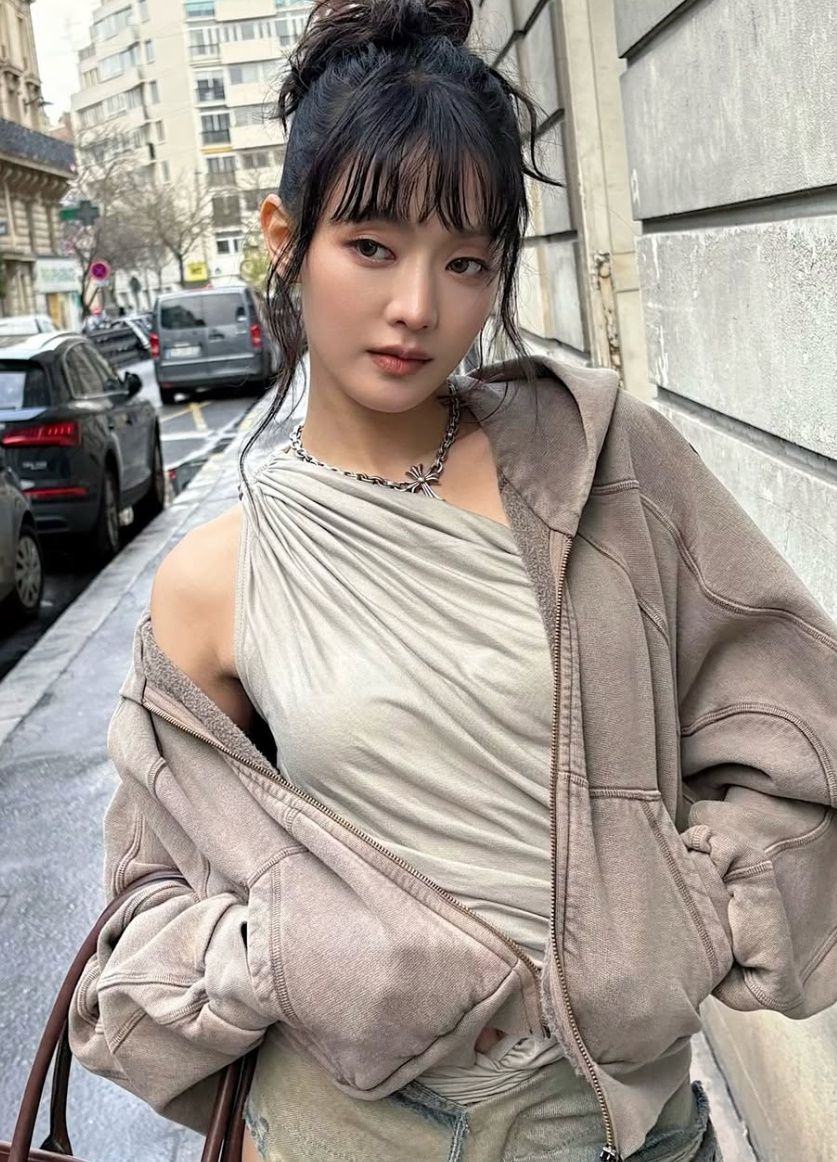 이어진 사진에서 민니는 후드 집업에 두 손을 넣은 채 자연스러운 포즈를 취하고 있는 모습. 자연스럽게 묶은 헤어스타일과 은은한 립, 그리고 미소가 조화를 이루며 고급스러운 분위기를 완성했다.