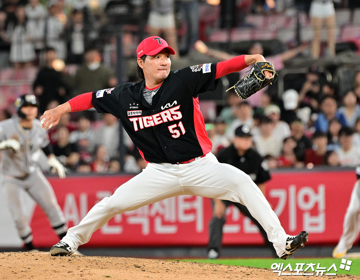 (엑스포츠뉴스 수원, 김한준 기자) 22일 오후 수원KT위즈파크에서 열린 '2025 신한 SOL Bank KBO리그' KIA 타이거즈와 KT 위즈의 경기, 7회말 2사 1루 KIA 전상현이 공을 힘차게 던지고 있다.