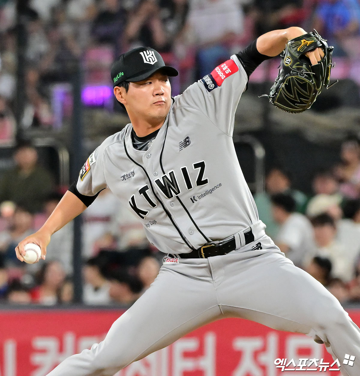 (엑스포츠뉴스 수원, 김한준 기자) 22일 오후 수원KT위즈파크에서 열린 '2025 신한 SOL Bank KBO리그' KIA 타이거즈와 KT 위즈의 경기, 9회초 KT 이정현이 공을 힘차게 던지고 있다.