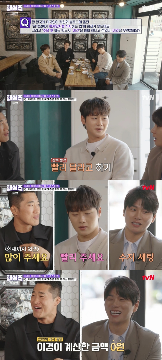 이날 제작진은 밥값내기 퀴즈 타임에 한 한국계 미국인이 자신의 블로그에 올린 '한식당에서 현지인처럼 식사하는 법'이 화제가 됐다. 그는 먼저 자리에 앉을 때는 안내를 기다리지 말고 자유롭게 앉으면 되고 종업원을 부를 때는 호출 버튼을 누르거나 저기요, 이모라고 부르면 된다고 했다. 그리고 주문 후에는 반드시 이것을 해야 된다고 했다. 무엇일까"라며 문제를 냈다.