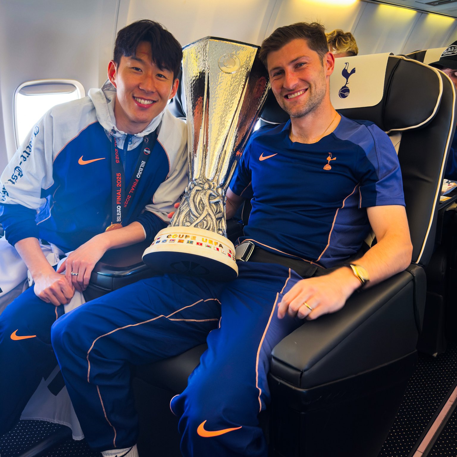 돌아가는 비행기 안에서도 손흥민은 우승 메달을 목에 건 채, 유로파리그 트로피를 들고 포즈를 취했다.