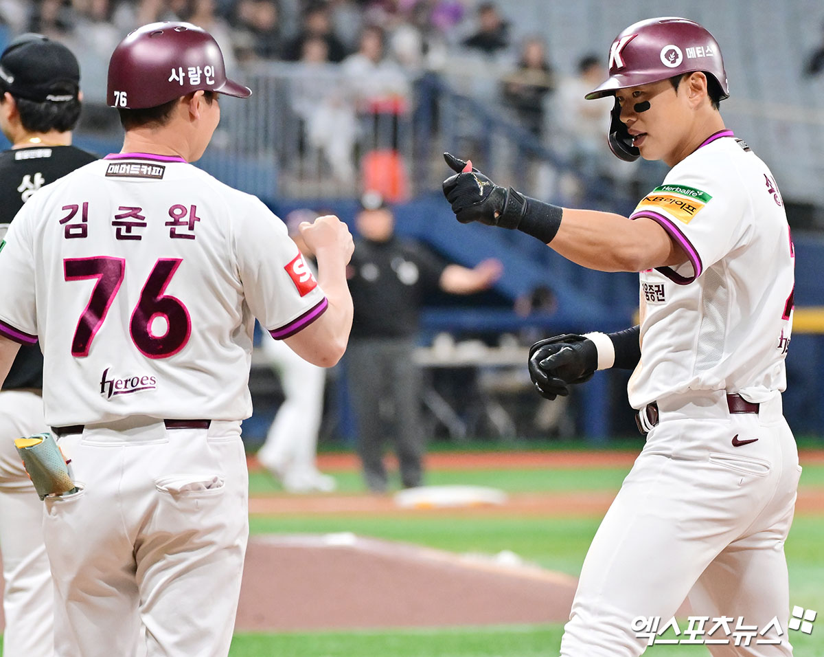 (엑스포츠뉴스 고척, 김한준 기자) 23일 오후 서울 구로구 고척스카이돔에서 열린 '2025 신한 SOL Bank KBO리그' KT 위즈와 키움 히어로즈의 경기, 5회말 무사 1루 키움 송성문이 우중간 안타를 날리고 있다.