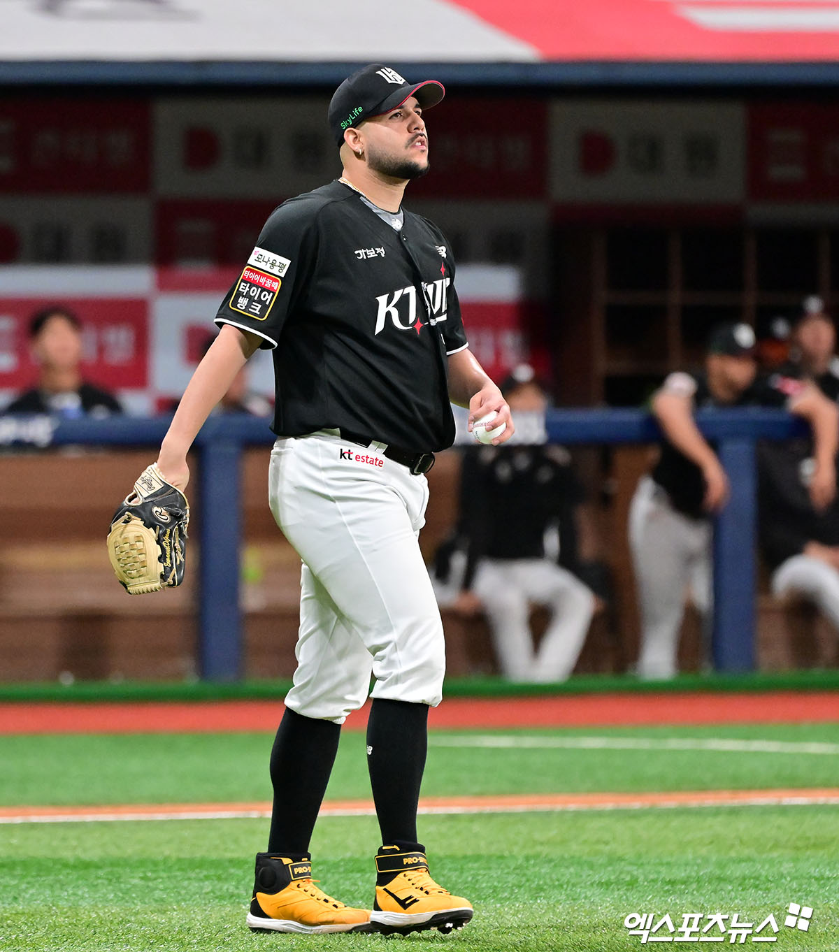(엑스포츠뉴스 고척, 김한준 기자) 24일 오후 서울 구로구 고척스카이돔에서 열린 '2025 신한 SOL Bank KBO리그' KT 위즈와 키움 히어로즈의 경기, 6회말 KT 헤이수스가 키움 이주형에게 솔로 홈런을 허용한 후 아쉬워하고 있다.