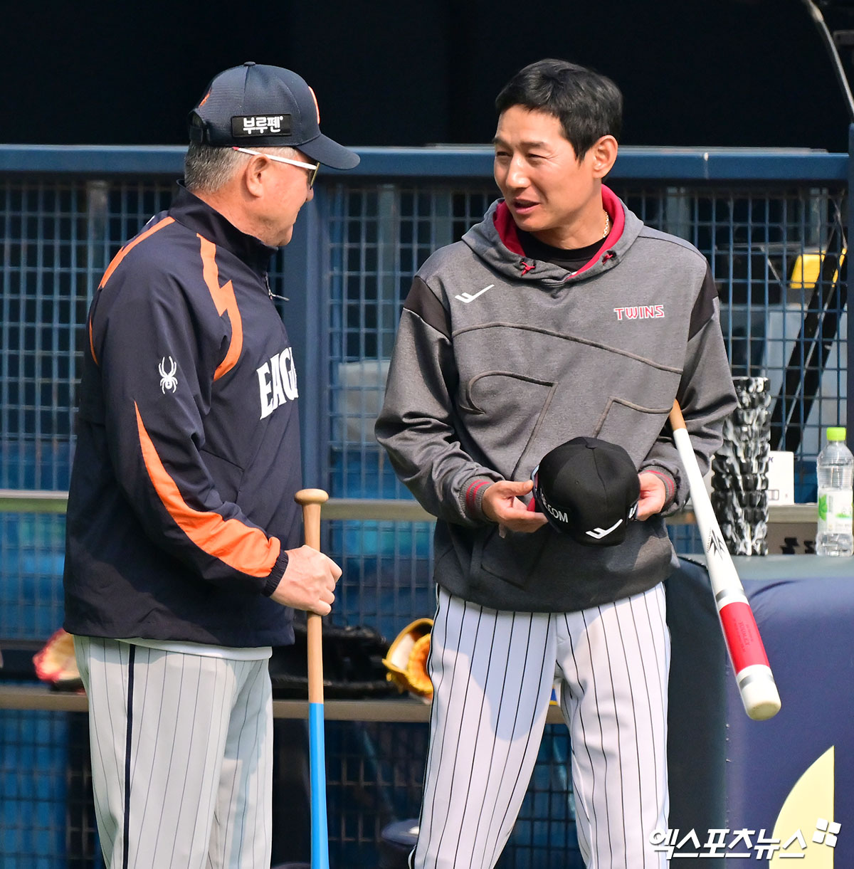 (엑스포츠뉴스 잠실, 김한준 기자) 27일 오후 서울 송파구 잠실야구장에서 열리는 '2025 신한 SOL Bank KBO리그' 한화 이글스와 LG 트윈스의 경기, 한화 김경문 감독과 LG 염경엽 감독이 인사를 나누고 있다.
