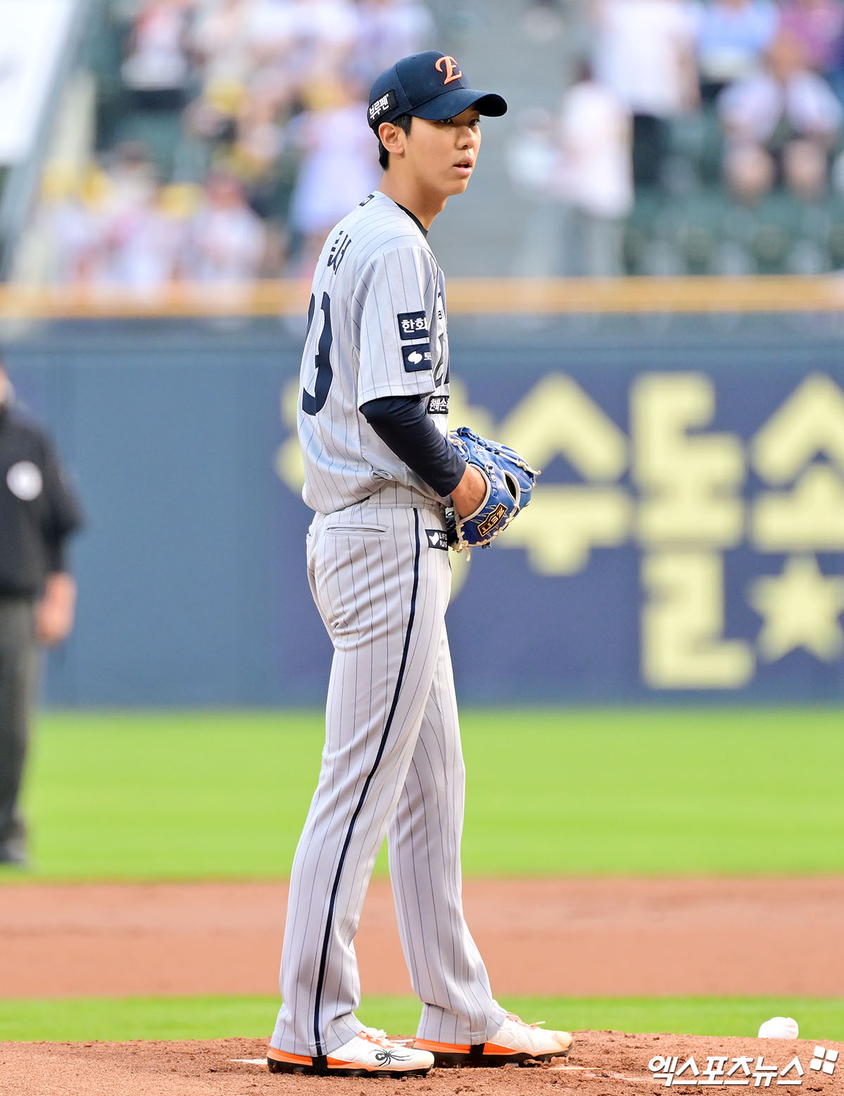 (엑스포츠뉴스 잠실, 김한준 기자) 27일 오후 서울 송파구 잠실야구장에서 열린 '2025 신한 SOL Bank KBO리그' 한화 이글스와 LG 트윈스의 경기, 1회말 한화 선발투수 황준서가 공을 힘차게 던지고 있다.