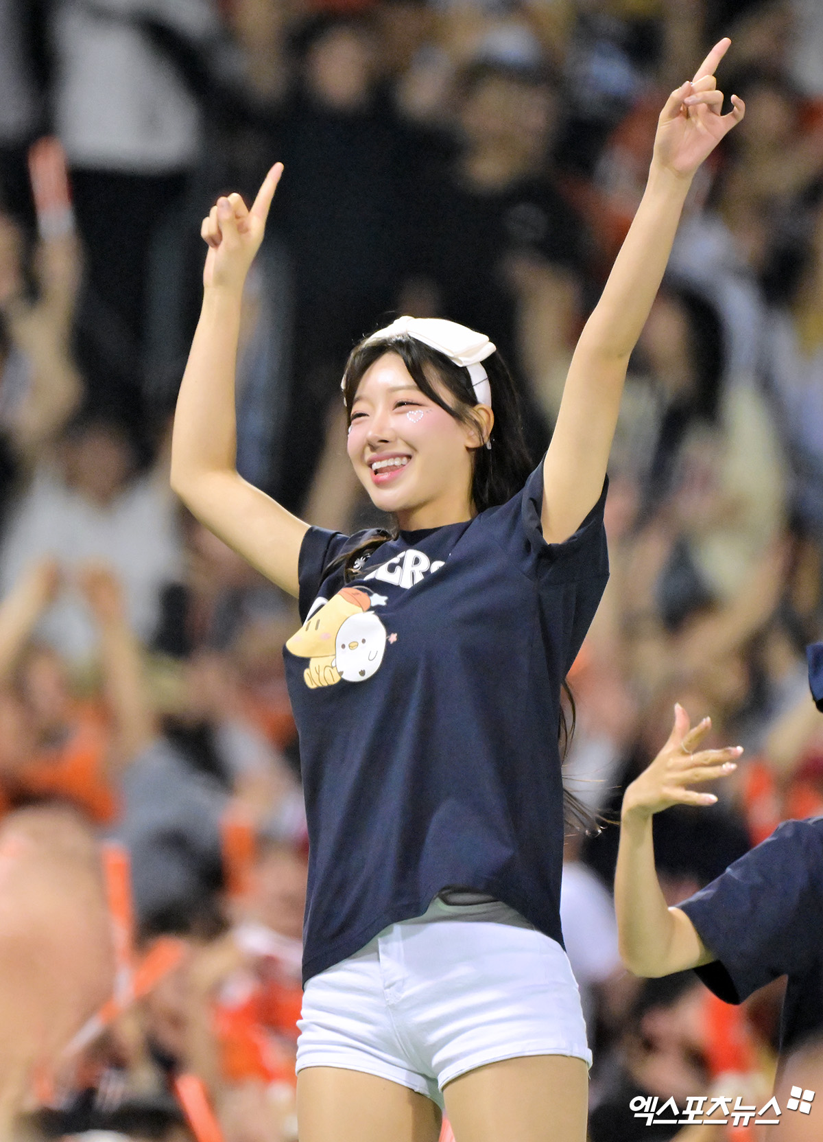 (엑스포츠뉴스 잠실, 김한준 기자) 27일 오후 서울 송파구 잠실야구장에서 열린 '2025 신한 SOL Bank KBO리그' 한화 이글스와 LG 트윈스의 경기, 우수한 치어리더가 열띤 응원을 선보이고 있다.