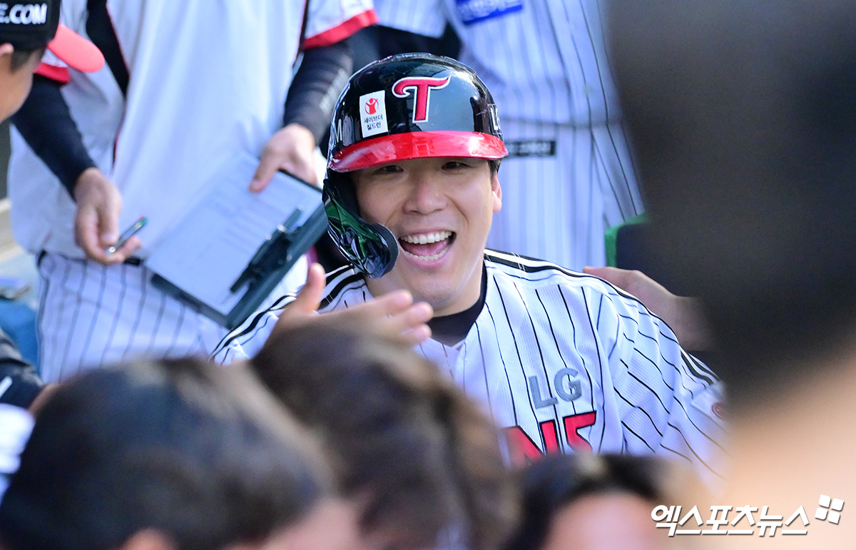 (엑스포츠뉴스 잠실, 김한준 기자) 28일 오후 서울 송파구 잠실야구장에서 열린 '2025 신한 SOL Bank KBO리그' 한화 이글스와 LG 트윈스의 경기, 4회말 1사 LG 김현수가 솔로 홈런을 날린 후 기뻐하고 있다.