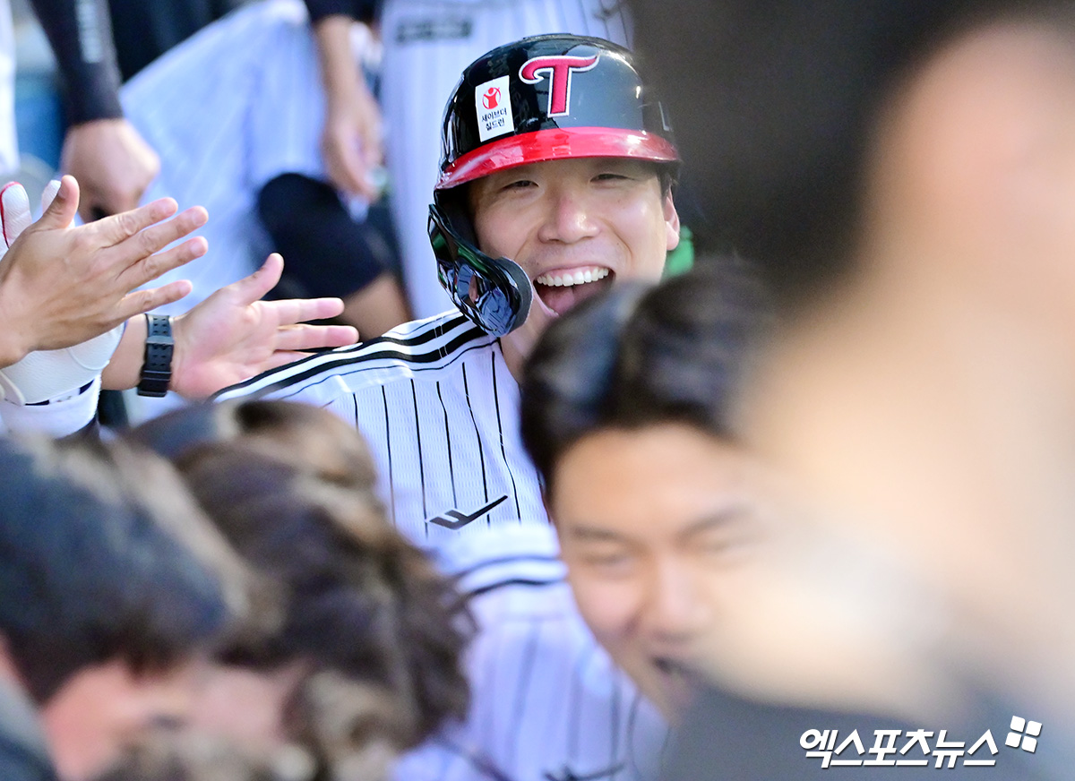 (엑스포츠뉴스 잠실, 김한준 기자) 28일 오후 서울 송파구 잠실야구장에서 열린 '2025 신한 SOL Bank KBO리그' 한화 이글스와 LG 트윈스의 경기, 4회말 1사 LG 김현수가 솔로 홈런을 날린 후 기뻐하고 있다.