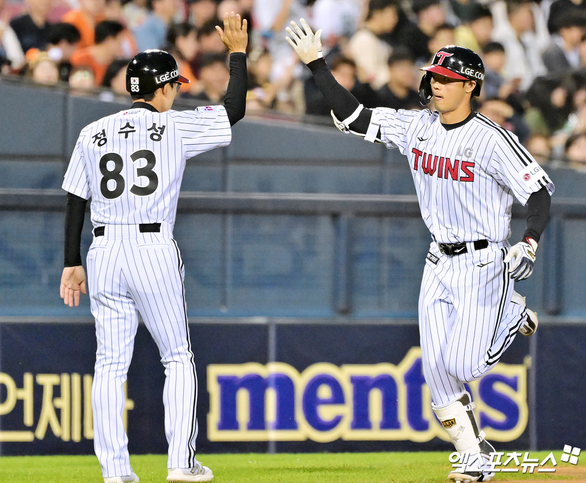 (엑스포츠뉴스 잠실, 김한준 기자) 28일 오후 서울 송파구 잠실야구장에서 열린 '2025 신한 SOL Bank KBO리그' 한화 이글스와 LG 트윈스의 경기, 6회말 1사 LG 이영빈이 솔로 홈런을 날린 후 기뻐하고 있다.