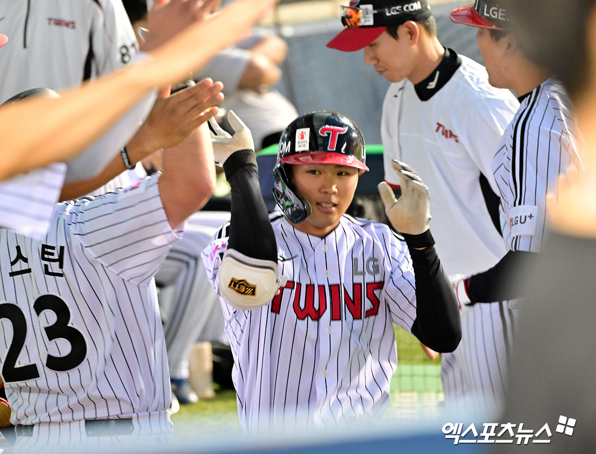 (엑스포츠뉴스 잠실, 김한준 기자) 28일 오후 서울 송파구 잠실야구장에서 열린 '2025 신한 SOL Bank KBO리그' 한화 이글스와 LG 트윈스의 경기, 6회말 1사 LG 이영빈이 솔로 홈런을 날린 후 더그아웃에서 축하를 받고 있다.