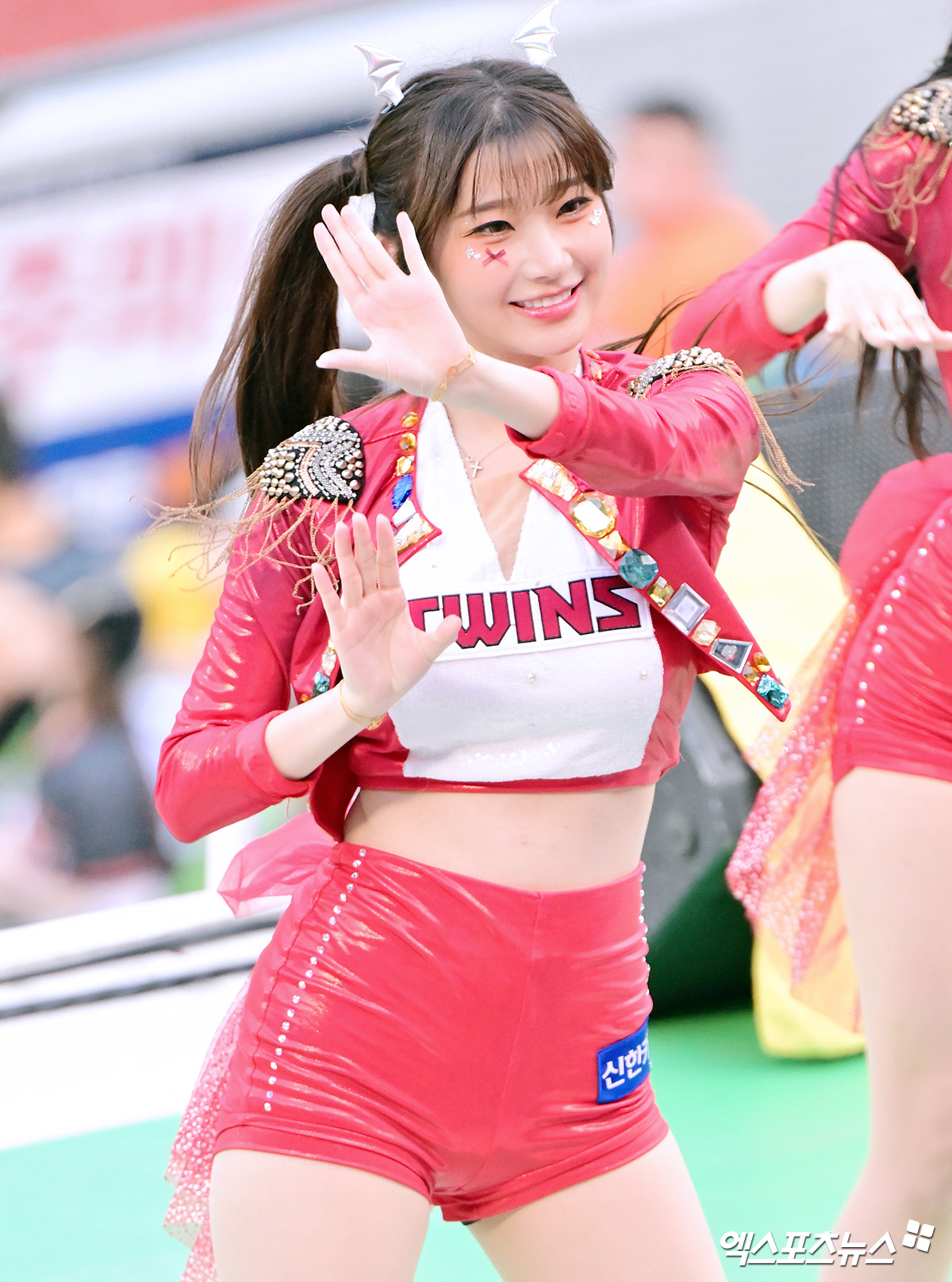 (엑스포츠뉴스 잠실, 김한준 기자) 28일 오후 서울 송파구 잠실야구장에서 열린 '2025 신한 SOL Bank KBO리그' 한화 이글스와 LG 트윈스의 경기, 이주은 치어리더가 멋진 공연을 선보이고 있다.