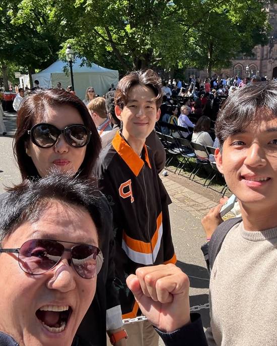 사진 속에는 손범수·진양혜 부부와 이들의 큰아들, 대학교 졸업 가운을 입은 둘째 아들까지 네가족이 카메라를 바라보며 환한 표정을 짓고 있는 모습이 담겨 있다.