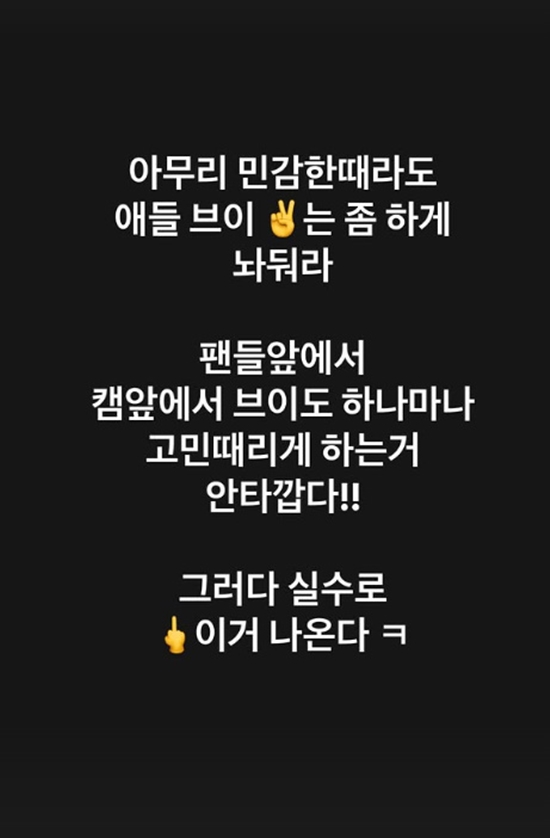 이어 그는 "아무리 민감한 때라도 애들 브이는 좀 하게 놔둬라. 팬들 앞에서 캠 앞에서 브이도 하나 마나 고민 때리게 하는 거 안타깝다. 그러다 실수 나온다"고 덧붙였다.