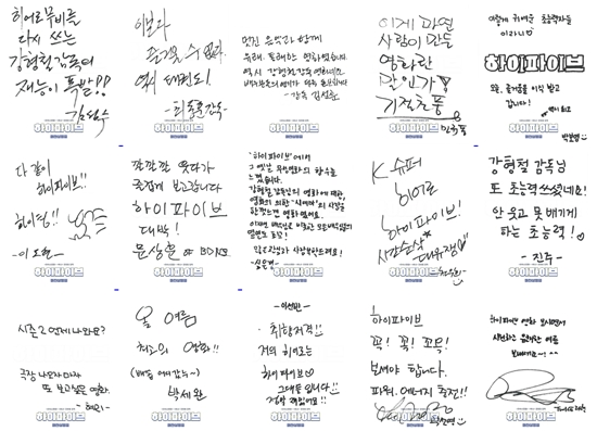 여기에 "이렇게 귀여운 초능력자들이라니, 오늘 즐거움을 이식받고 갑니다!"(배우 박보영), "다 같이 '하이파이브'!! 화이팅!"(배우 이도현), "깔깔깔 웃다가 즐겁게 보고 갑니다. '하이파이브' 대박!"(유튜브 크리에이터 겸 배우 문상훈), "강형철 감독님의 영화에 대한, 영화에 의한 '시네마'의 사랑을 한껏 느낀 영화. 이재인 배우님을 비롯한 모든 배우님들의 열연도 최고!"(배우 심은경), "K-슈퍼 히어로 '하이파이브'! 시간 순삭 대유잼"(배우 천우희), "강형철 감독님 또 초능력 쓰셨네요! 안 웃고 못 배기게 하는 초능력!"(배우 박진주), "시즌 2 언제 나와요? 극장 나오자마자 또 보고 싶은 영화"(배우 이혜리), "올여름 최고의 영화! 배꼽 어디 갔누~" (배우 박세완), "취향 저격! 저의 히어로는 '하이파이브' 그대들입니다!"(배우 이선빈), "꼭! 꼭! 꼬옥! 보셔야 합니다. 파워 에너지 충전!!"(배우 곽선영), "'하이파이브' 영화 보시면서 시원하고 유쾌한 여름 보내세요~!"(가수 트와이스 다현) 등 다양한 셀럽들의 폭발적인 추천 세례는 예비 관객들의 관람 욕구를 자극한다.