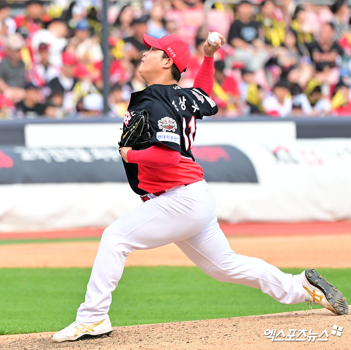 (엑스포츠뉴스 수원, 김한준 기자) 31일 오후 수원KT위즈파크에서 열린 '2025 신한 SOL Bank KBO리그' KIA 타이거즈와 KT 위즈의 경기, 8회말 KIA 조상우가 공을 힘차게 던지고 있다.