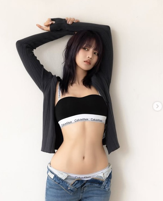 공개된 사진 속 민니는 브라톱과 청바지를 매치한 패션을 완벽 소화, 비현실적인 몸매 라인을 과시했다.