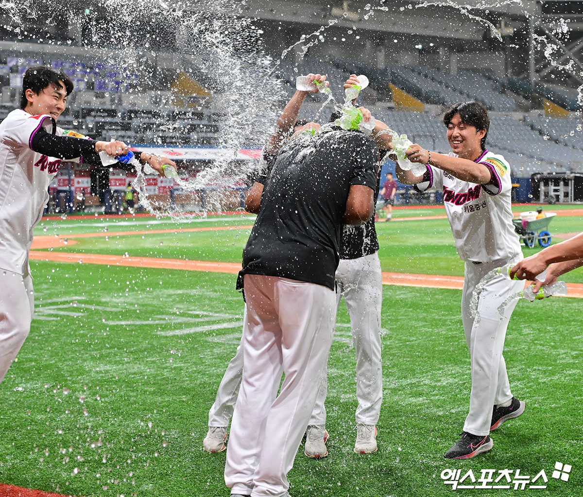 이날 경기에서 승리한 키움 알칸타라가 축하물세례를 맞고 있다.