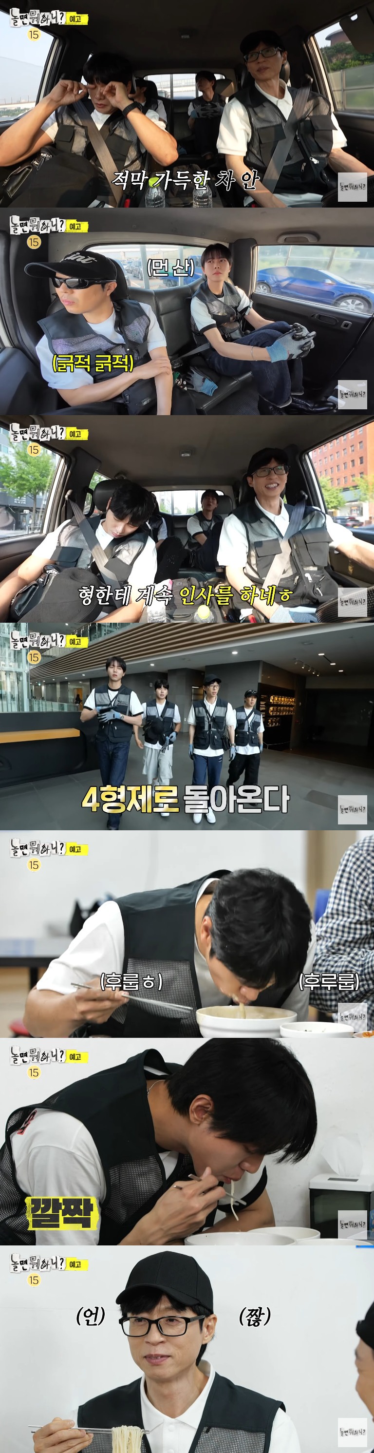운전석에 앉아 있는 유재석의 옆으로 이이경은 하품을, 뒷좌석의 하하와 주우재는 창밖을 멍하니 응시하고 있었다.