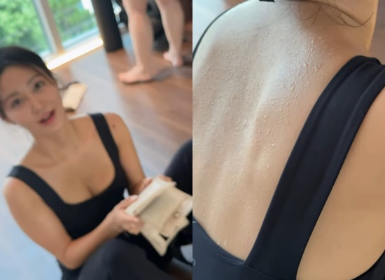 운동복을 입은 한그루에 등에는 땀방울이 맺혀 있어 운동에 집중했던 열정을 엿보게 한다.