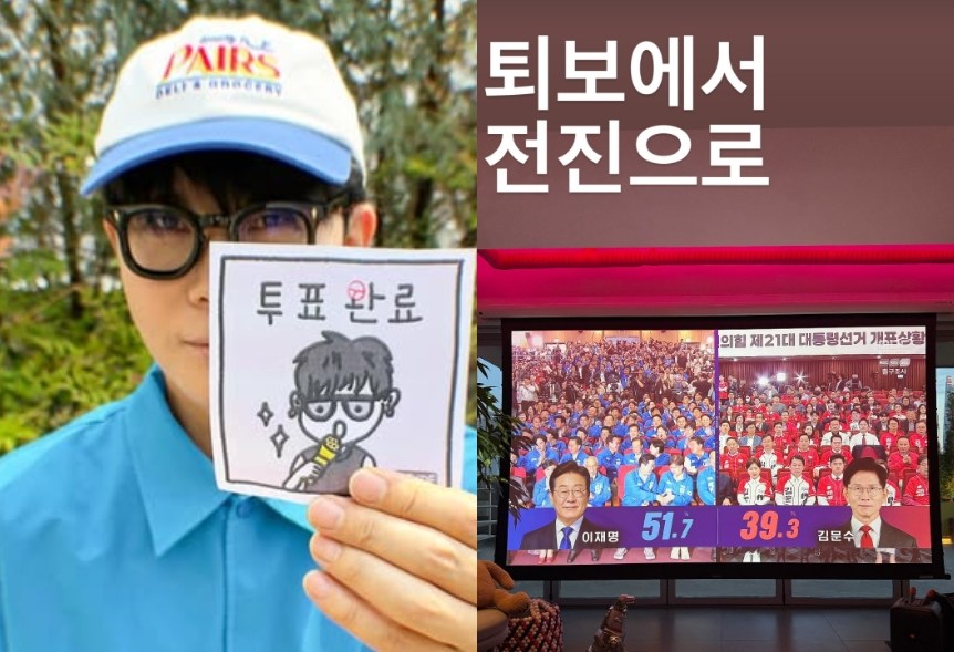 출구조사 결과 더불어민주당 이재명 후보의 당선 가능성이 높아지자 이승환은 이를 ‘전진’이라 표현하며 환영의 뜻을 내비친 것으로 보인다.