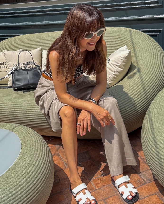 또한 채정안은 무릎 아래로 떨어지는 와이드한 핏의 버뮤다 팬츠로 특유의 여유로운 스타일링을 뒷받침했으며, 브라운 컬러 벨트로 허리 라인을 강조해 단정한 실루엣을 자랑했다.