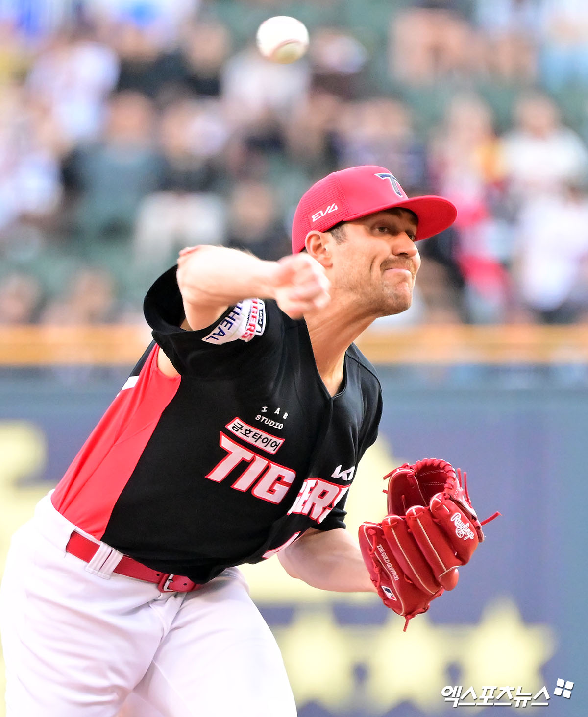 (엑스포츠뉴스 잠실, 김한준 기자) 4일 오후 서울 송파구 잠실야구장에서 열린 '2025 신한 SOL Bank KBO리그' KIA 타이거즈와 두산 베어스의 경기, 1회말 KIA 선발투수 네일이 공을 힘차게 던지고 있다.