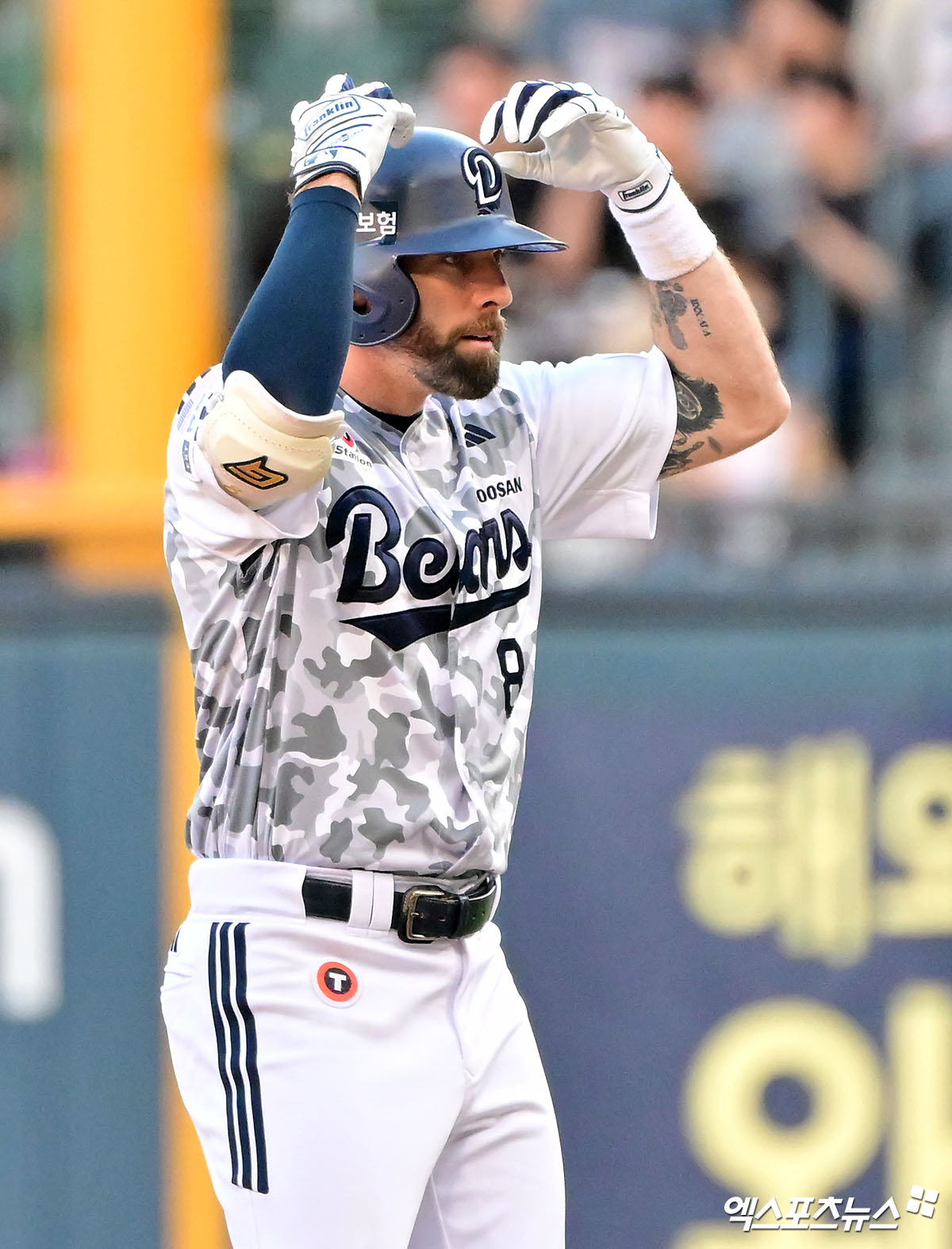 (엑스포츠뉴스 잠실, 김한준 기자) 4일 오후 서울 송파구 잠실야구장에서 열린 '2025 신한 SOL Bank KBO리그' KIA 타이거즈와 두산 베어스의 경기, 1회말 1사 두산 케이브가 우전안타를 날리고 있다.
