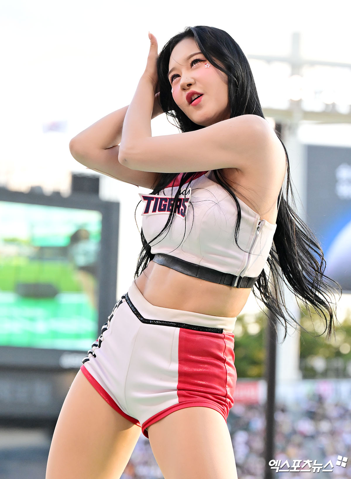 (엑스포츠뉴스 잠실, 김한준 기자) 4일 오후 서울 송파구 잠실야구장에서 열린 '2025 신한 SOL Bank KBO리그' KIA 타이거즈와 두산 베어스의 경기, 유세리 치어리더가 멋진 공연을 선보이고 있다.