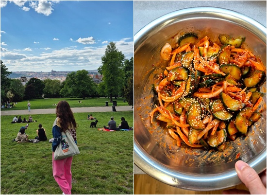 여기에 더해 그는 체코의 케이크를 추천하기도 하고 한식을 만들어 먹는 즐거움을 적기도 했다. 김지수는 "반찬으로 오이무침과 파프리카 넣고 느타리버섯 볶았는데 체코의 오이는 한국 오이보다는 조금 덜 아삭거리지만 충분히 맛있어서 이렇게 오이무침도 할 수 있어 행복해요. 오이무침 해먹는 게 행복할 줄이야"라며 반찬과 라면 사진도 공유했다.