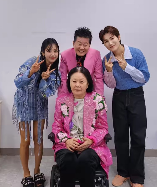 공개된 사진 속에는 태진아가 아내 이옥형(옥경이)이 타 있는 휠체어 뒤에서 김희재, 강혜연과 함께 미소를 짓고 있는 모습이다.