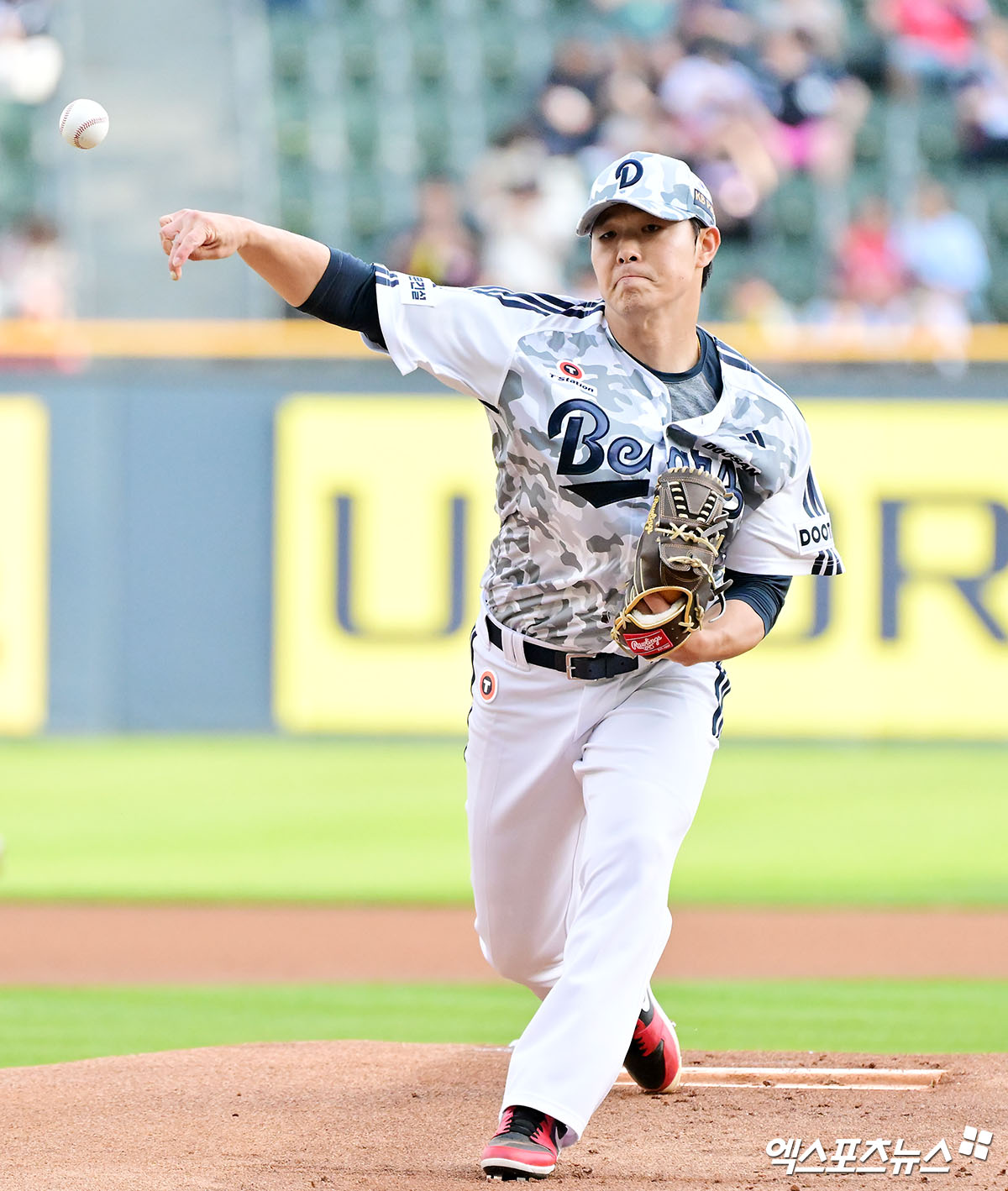 (엑스포츠뉴스 잠실, 김한준 기자) 5일 오후 서울 송파구 잠실야구장에서 열린 '2025 신한 SOL Bank KBO리그' KIA 타이거즈와 두산 베어스의 경기, 1회초 두산 선발투수 최원준이 공을 힘차게 던지고 있다.