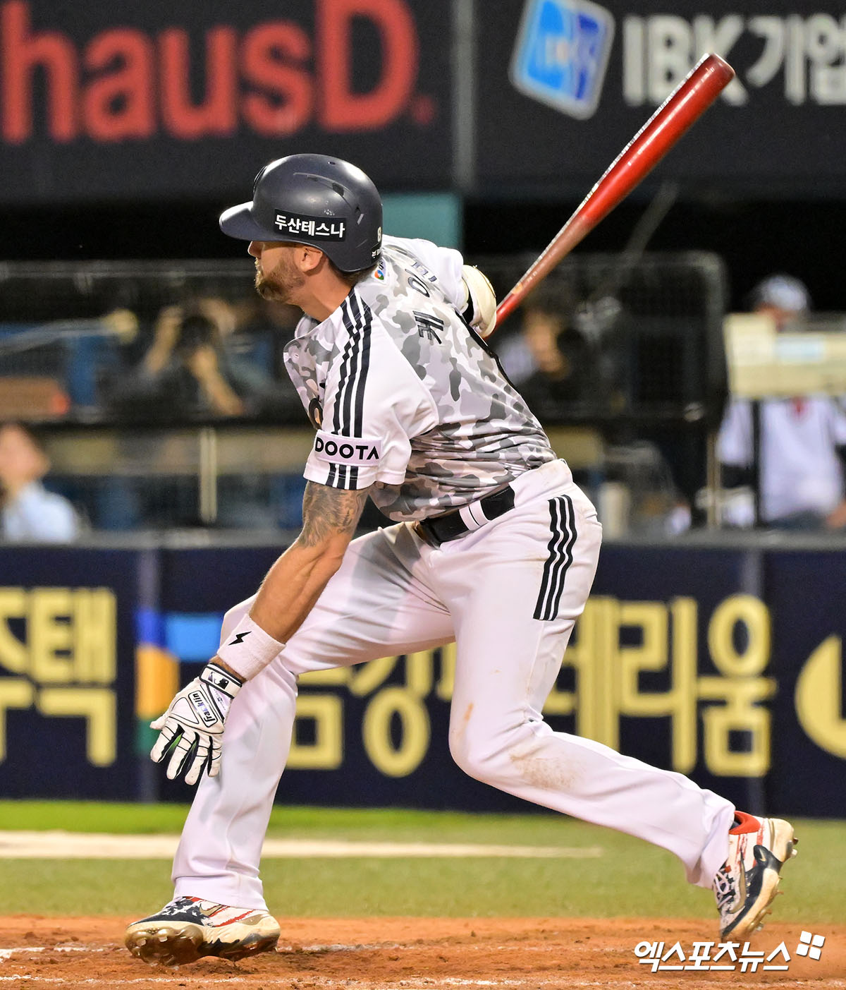 (엑스포츠뉴스 잠실, 김한준 기자) 5일 오후 서울 송파구 잠실야구장에서 열린 '2025 신한 SOL Bank KBO리그' KIA 타이거즈와 두산 베어스의 경기, 8회말 1사 두산 케이브가 우전안타를 날리고 있다.