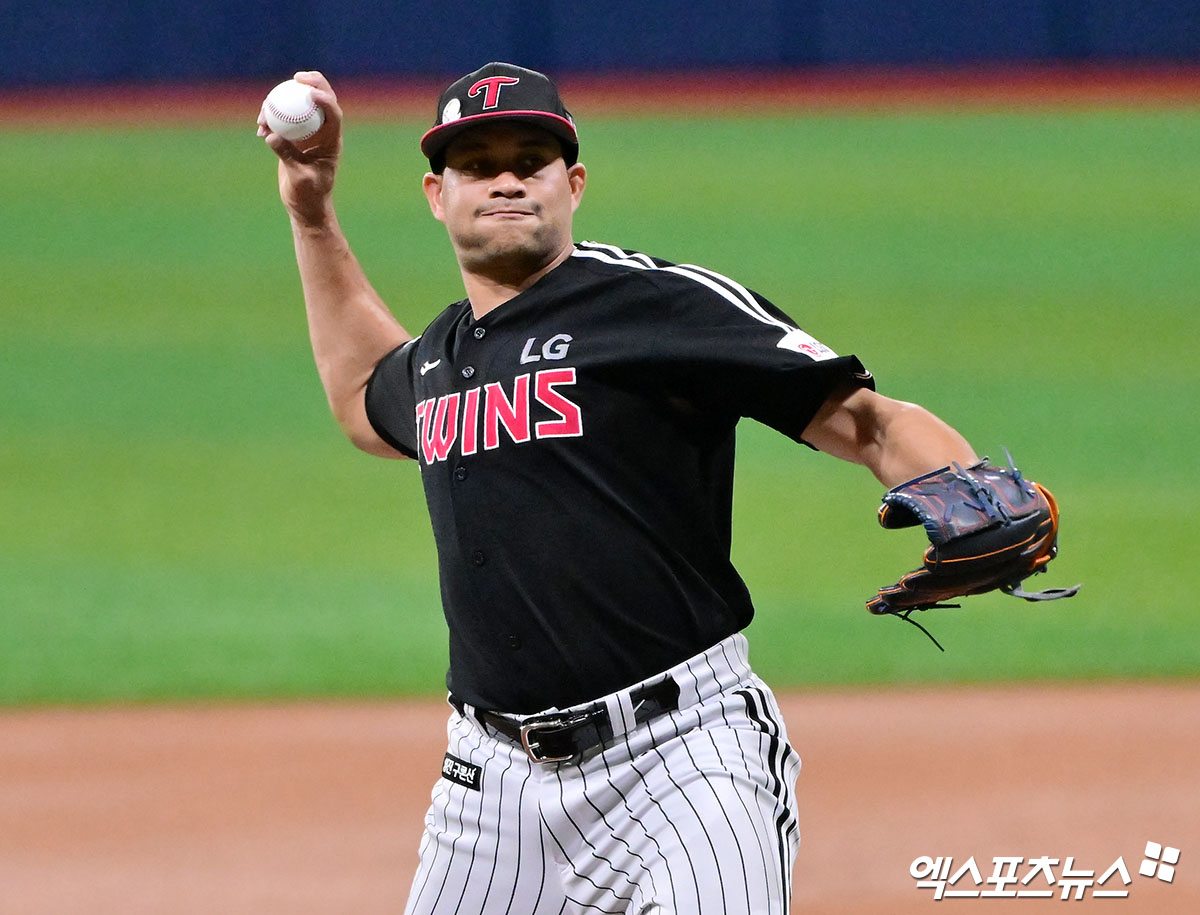 (엑스포츠뉴스 고척, 김한준 기자) 6일 오후 서울 구로구 고척스카이돔에서 열린 '2025 신한 SOL Bank KBO리그' LG 트윈스와 키움 히어로즈의 경기, 1회말 LG 선발투수 치리노스가 공을 힘차게 던지고 있다.