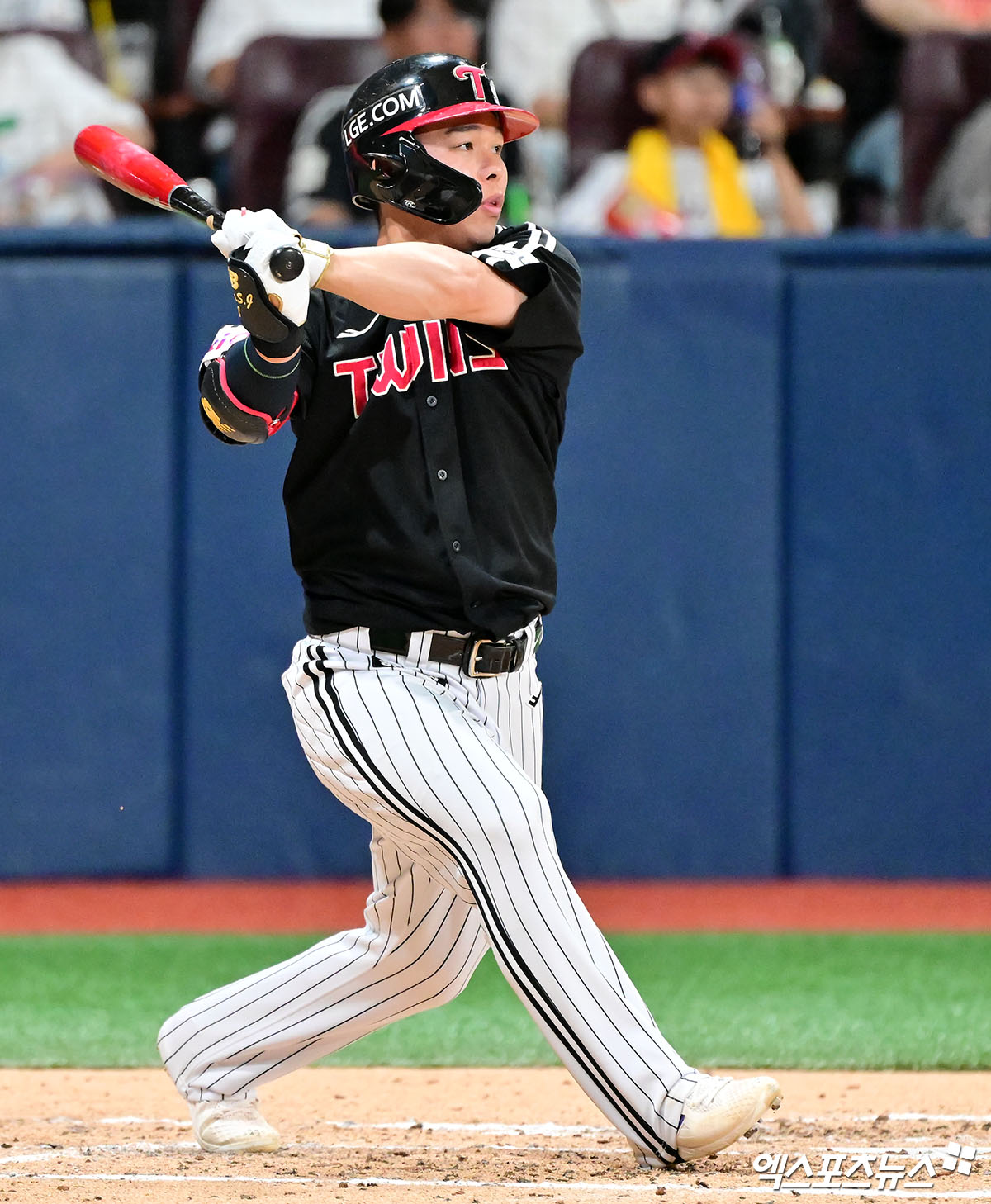 (엑스포츠뉴스 고척, 김한준 기자) 6일 오후 서울 구로구 고척스카이돔에서 열린 '2025 신한 SOL Bank KBO리그' LG 트윈스와 키움 히어로즈의 경기, 4회초 1사 1루 LG 문성주가 좌중간 2루타를 날리고 있다.