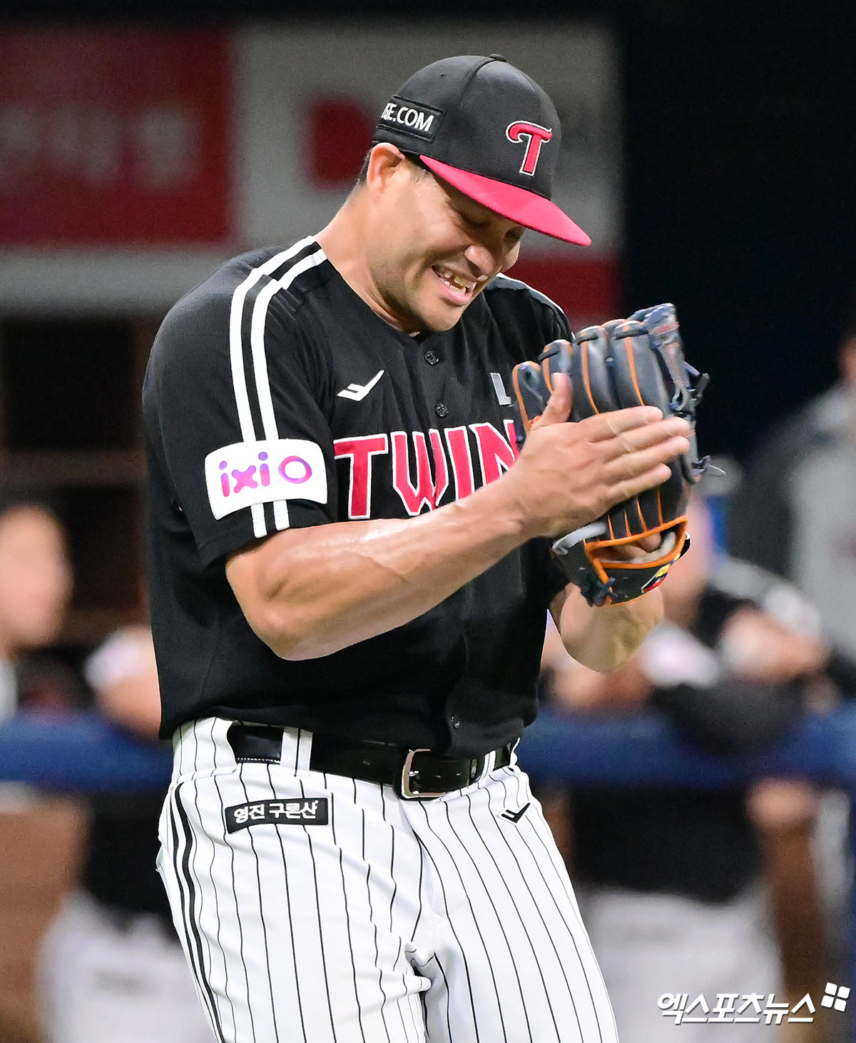 (엑스포츠뉴스 고척, 김한준 기자) 6일 오후 서울 구로구 고척스카이돔에서 열린 '2025 신한 SOL Bank KBO리그' LG 트윈스와 키움 히어로즈의 경기, 7회말 수비를 마친 LG 치리노스가 기뻐하고 있다.