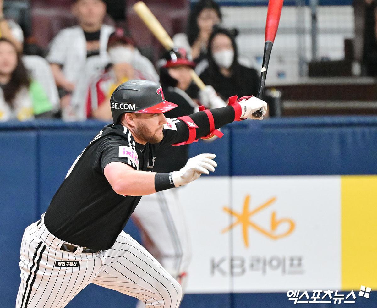 (엑스포츠뉴스 고척, 김한준 기자) 8일 오후 서울 구로구 고척스카이돔에서 열린 '2025 신한 SOL Bank KBO리그' LG 트윈스와 키움 히어로즈의 경기, 1회초 1사 3루 LG 오스틴이 3루 주자를 불러들이는 타격을 하고 있다.