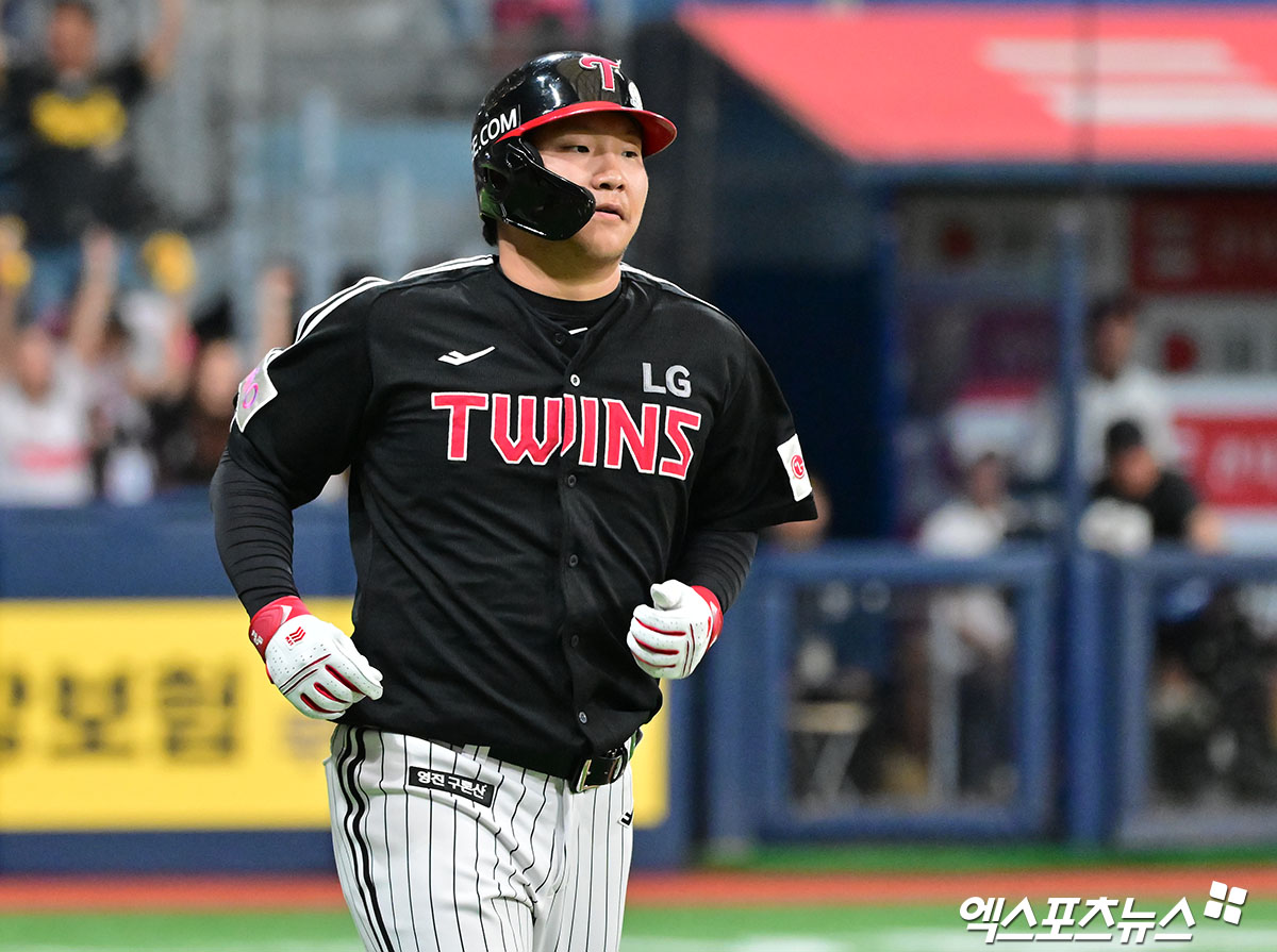 (엑스포츠뉴스 고척, 김한준 기자) 8일 오후 서울 구로구 고척스카이돔에서 열린 '2025 신한 SOL Bank KBO리그' LG 트윈스와 키움 히어로즈의 경기, 7회초 2사 1루 LG 문보경이 투런 홈런을 날리고 있다.