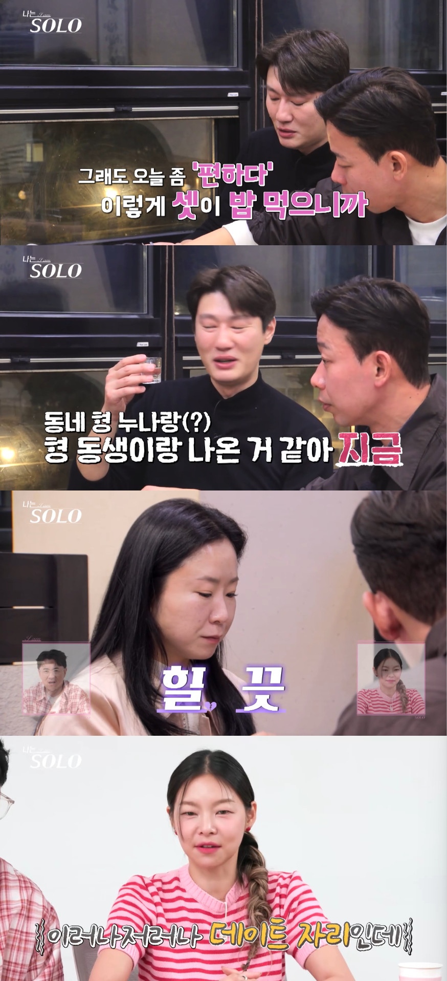 이날 고깃집으로 향한 세 사람은 술과 함께 데이트를 즐겼다. 대화 중 영철은 "그래도 오늘 좀 편하다. 이렇게 셋이 밥 먹으니까"라며 "동네 형, 누나랑 형, 동생 이렇게 나온 것 같다"고 발언했다.