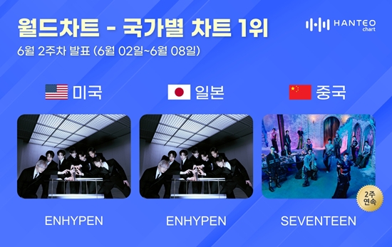 세계 유일의 실시간 음악차트인 한터차트는 13일 오전, 6월 2주 차(집계 기간 2일~8일) 미국, 일본, 중국 국가별 차트 TOP 30을 발표했다. 이에 따르면 엔하이픈과 세븐틴이 각 부문 1위를 차지했습니다.