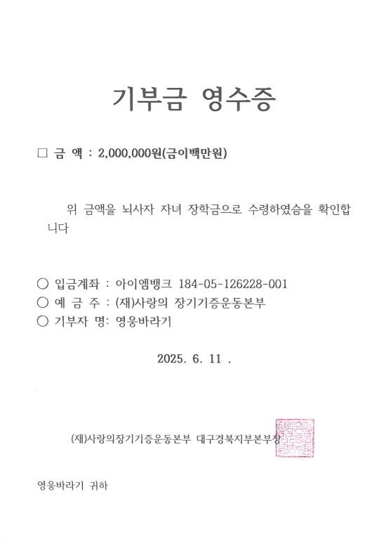 이번 기부는 장기기증센터를 통해 생명을 살린 영웅의 유가족을 응원하고, 자녀들에게 도움이 되고자 기획했다.