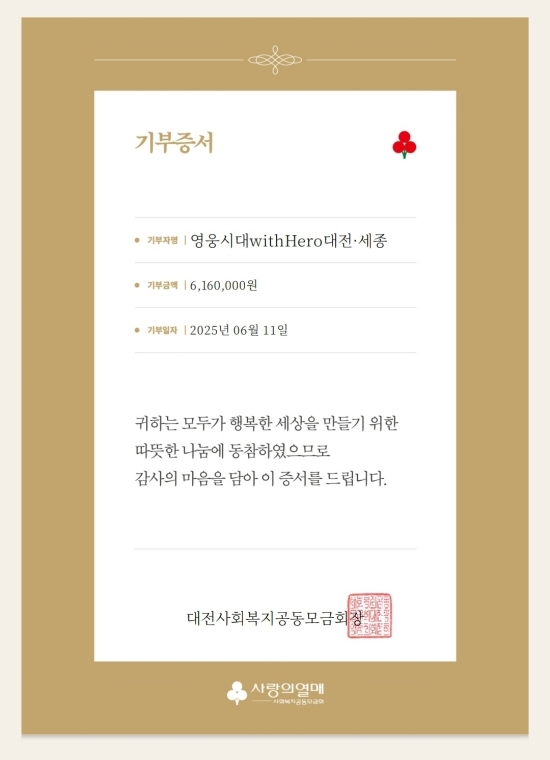 한편,'영웅시대 withHero대전·세종' 은 2020년 동구를 시작으로 대덕구·중구·서구·세종 등에서 꾸준히 나눔을 실천했다. 이들의 누적 후원금은 4,900만 원에 달한다.