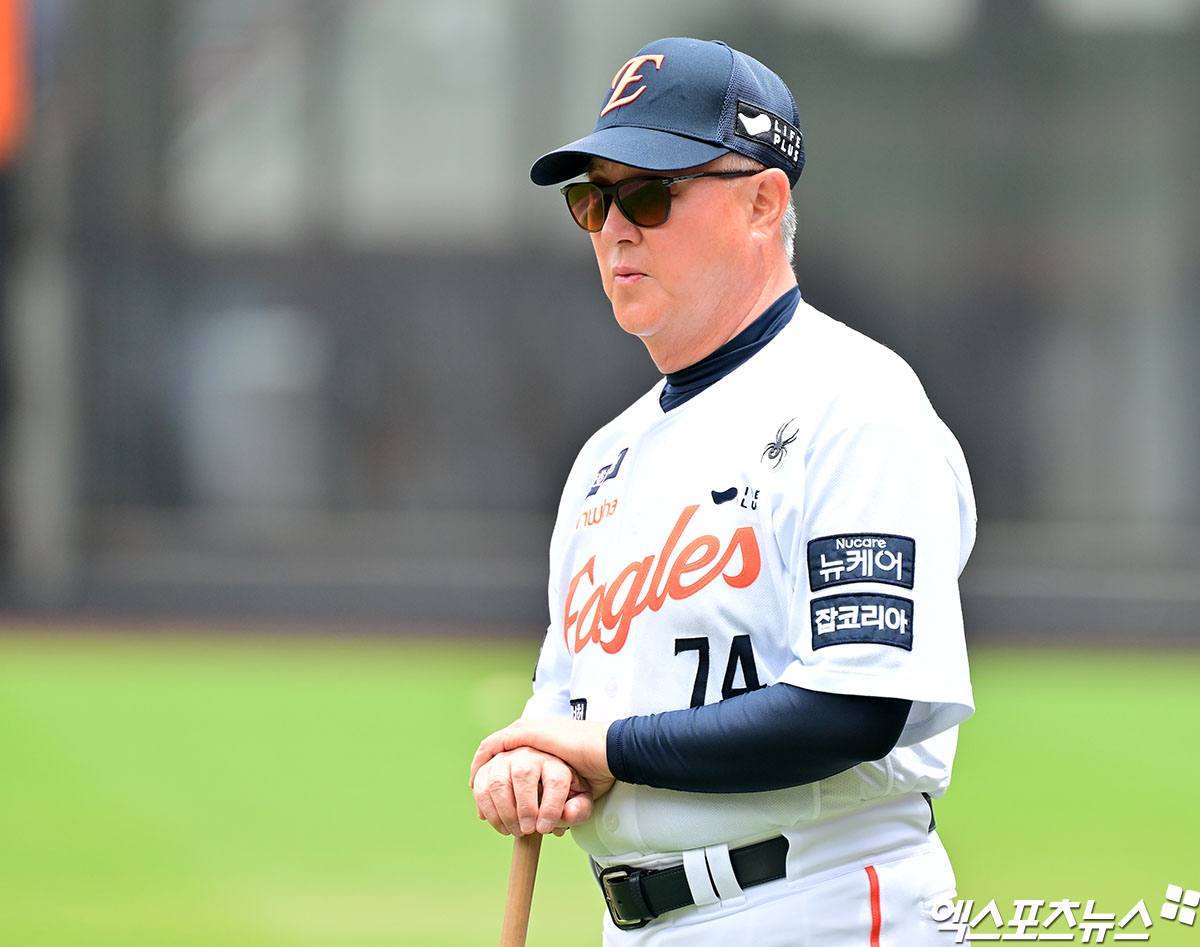 (엑스포츠뉴스 대전, 김한준 기자) 14일 오후 대전 한화생명 볼파크에서 열리는 '2025 신한 SOL Bank KBO리그' LG 트윈스와 한화 이글스의 경기, 한화 김경문 감독이 선수들의 훈련을 지켜보고 있다.