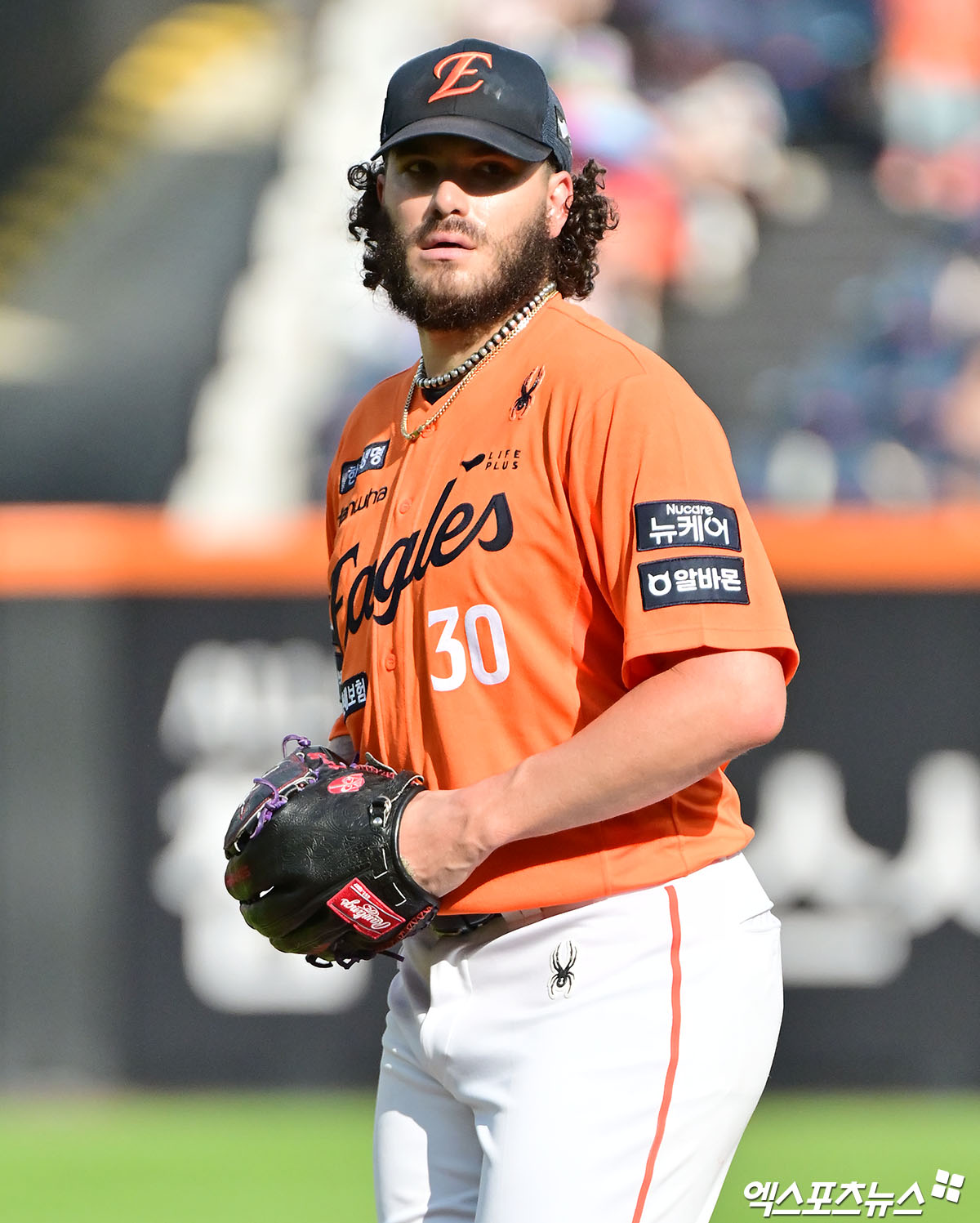 (엑스포츠뉴스 대전, 김한준 기자) 14일 오후 대전 한화생명 볼파크에서 열린 '2025 신한 SOL Bank KBO리그' LG 트윈스와 한화 이글스의 경기, 1회초 한화 선발투수 폰세가 공을 힘차게 던지고 있다.