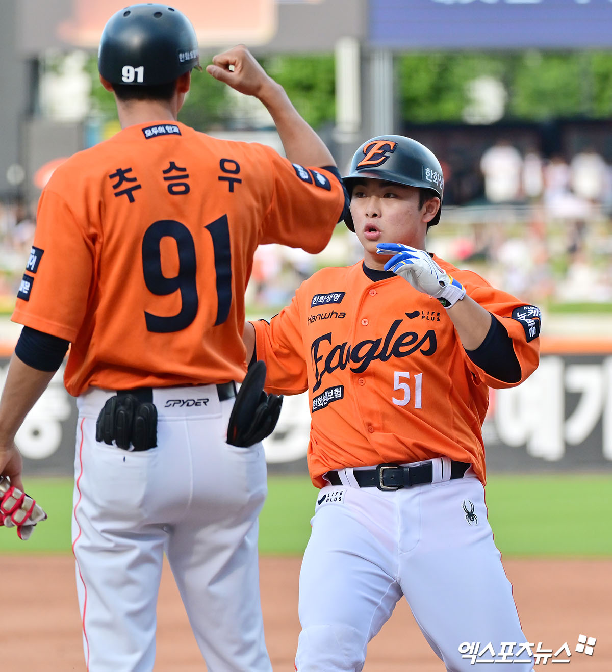 (엑스포츠뉴스 대전, 김한준 기자) 14일 오후 대전 한화생명 볼파크에서 열린 '2025 신한 SOL Bank KBO리그' LG 트윈스와 한화 이글스의 경기, 1회말 2사 한화 문현빈이 우중간 안타를 날리고 있다.