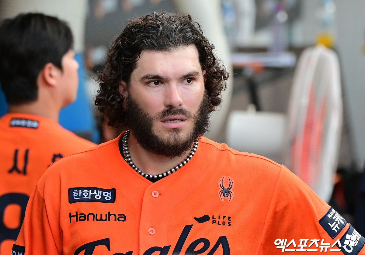 (엑스포츠뉴스 대전, 김한준 기자) 14일 오후 대전 한화생명 볼파크에서 열린 '2025 신한 SOL Bank KBO리그' LG 트윈스와 한화 이글스의 경기, 6회초 수비를 마친 한화 폰세가 아쉬워하고 있다.