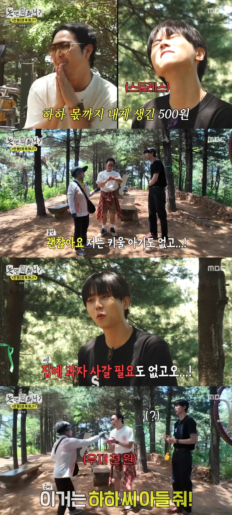 그렇게 주우재로부터 천 원을 받은 어르신은 지폐를 도로 하하에게 건네며 "이거는 하하 씨 아들 주라"고 말했다. 이에 당황한 주우재는 어르신이 떠난 후 하하의 엉덩이를 발로 차며 분노를 표했다.
