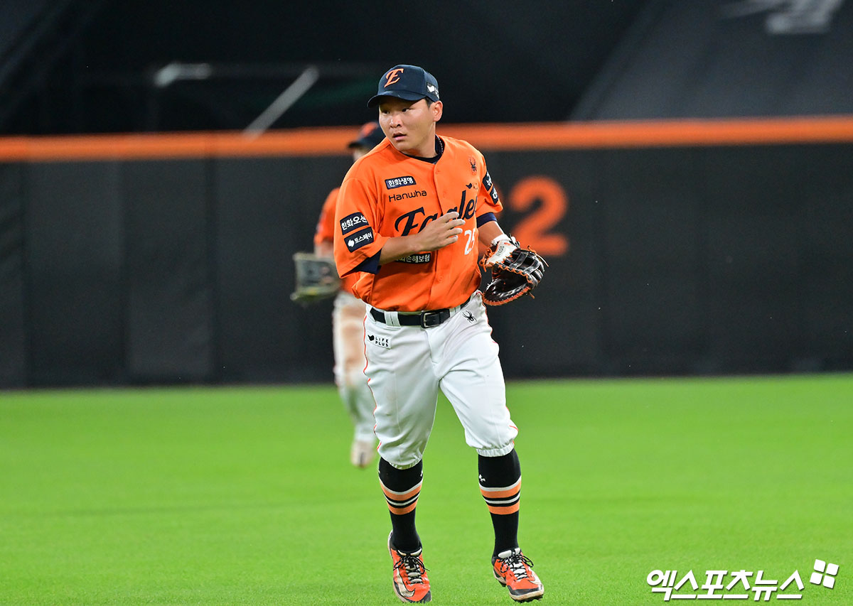 (엑스포츠뉴스 대전, 김한준 기자) 14일 오후 대전 한화생명 볼파크에서 열린 '2025 신한 SOL Bank KBO리그' LG 트윈스와 한화 이글스의 경기, 9회초수비를 마친 한화 김태연이 더그아웃으로 향하고 있다.