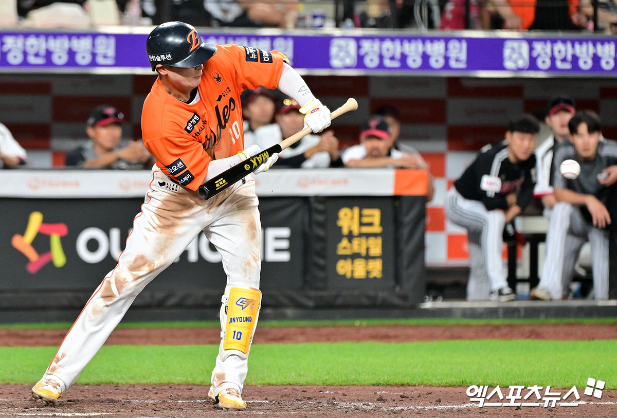 (엑스포츠뉴스 대전, 김한준 기자) 14일 오후 대전 한화생명 볼파크에서 열린 '2025 신한 SOL Bank KBO리그' LG 트윈스와 한화 이글스의 경기, 11회말 무사 1루 한화 이진영이 번트를 시도하고 있다.